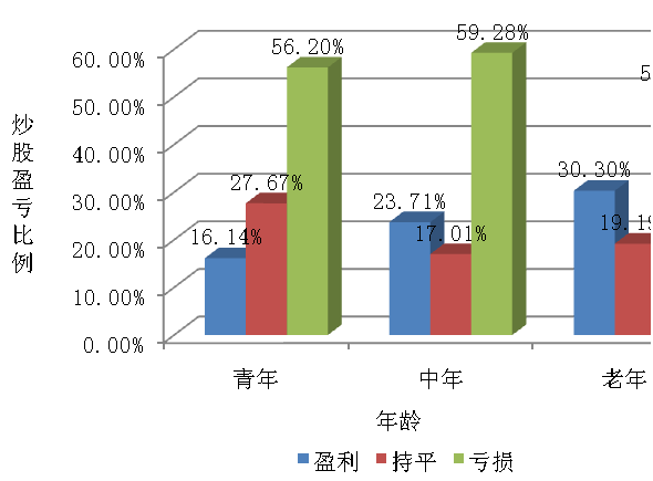 在户主为青年的家庭中,炒股盈利占16.14%;盈亏平衡的家庭占27.67%;亏损的家庭占56.20%。在中年家庭中,炒股盈利的占23.71%;盈亏平衡的占17.01%;亏损的占59.28%。在老年家庭中,炒股盈利的占30.30%;盈亏平衡的占19.19%;亏损的占50.51%。总体来看,随着年龄的增加,炒股赚钱的比例呈增加的态势。