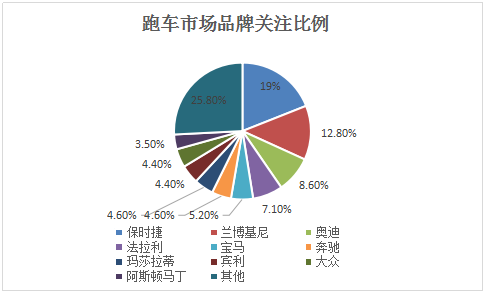 中国跑车市场上,保时捷以19.0%的市场关注份额排名品牌关注榜的首位,蝉联最受消费者关注的跑车品牌。兰博基尼和奥迪分列第二和第三名,市场关注份额分别为12.8%和8.6%。法拉利、宝马、奔驰和玛莎拉蒂等品牌分列其后,前十名的品牌累计占据了74.2%的市场关注份额。