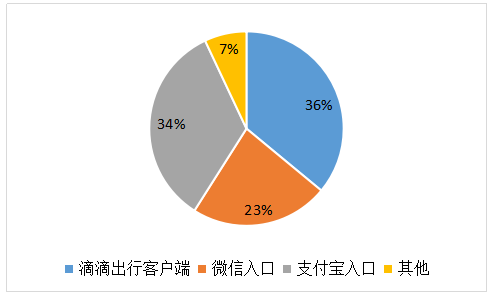 在本次调查中如图所示,使用“滴滴出行”APP客户端的消费者是最多的,位居首位;其次是支付宝的入口,紧接着为微信入口。