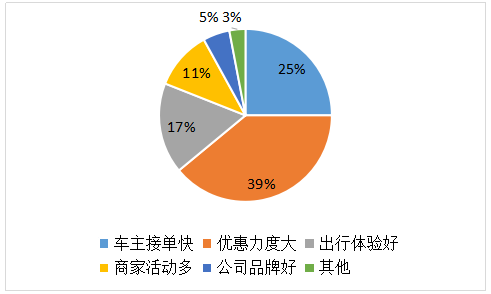 优惠条件是用户选择滴滴快车时考虑的第一因素。一方面由于商家想要快速圈住用户,另一方面是同类公司当中竞争激烈,同时也为了移动出行的快速普及,各大移动出行软件对用户及车主都有一定程度的补贴,这不仅圈住了一些以前也经常打车的用户,更吸引了大部分不常打车的人群成为用户,而这类人群首要考虑的就是价格。接单速度是用户考虑的第二大因素,毕竟速度意味着效率。随着移动出行软件的大普及,越来越多的用户开始注重出行体验和服务质量,有17%的用户选择此项。