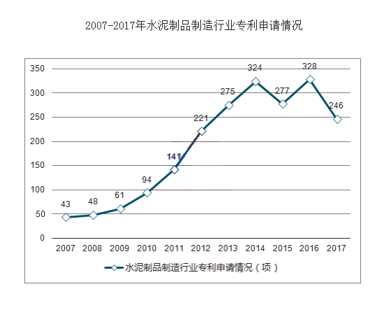 在引进国外先进技术与设备的同时,水泥制品行业也开始了自主研发的步伐,并取得了较大的进展。数据显示,2007以来,水泥制品制造行业专利申请大幅增长;到2017年,行业专利申请达到246项。