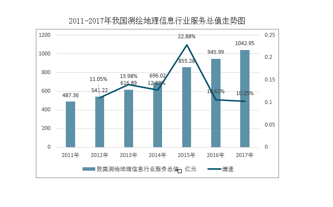我国测绘地理信息行业规模不断扩大,2017年测绘地理信息行业服务总值达1042.95亿元,近年来市场增速维持在10%以上。