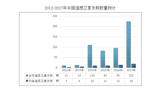 据统计,迄今中国已有100多颗在轨卫星,主要包括通信卫星、遥感卫星、导航卫星三种类型的卫星。2016年全球遥感卫星发射总数额为95颗,其中中国发射数量为14颗,2017年全球遥感卫星发射总数额为225颗,其中中国发射数量为19颗。