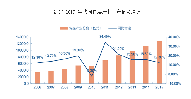 2015 年以来,经济增速的持续放缓使得产业转型升级的需求不断增强,新兴产业被市场寄予了深切的期望。消费的扩容和技术的升级成为支撑文化传媒产业持续健康发展的底层动力,传媒行业持续进入中长期景气阶段。2015 年传媒行业的整体市场规模达到 12754 亿元,同比增长 12.3%,相对于 GDP 增速高出 5.6 个百分点