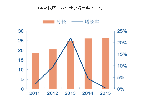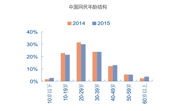 从网络使用深度上看,2015 年中国网民的人均周上网时长为 26.2 小时,较 2014 年底仅增长 0.1 小时,基本持平。从人群结构来看,网民中男女占比分别达到 53.6%和 46.4%,发展进一步均衡化。年龄结构方面,30 岁以下的人群已经占到网民群体的 54%。