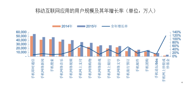 在移动互联网发展的助推之下,2015 年,整体互联网应用都呈现了上升发展的态势。数据显示,移动支付、移动购物、移动旅行预订和移动炒股的增长都超过了 40%。以移动支付、移动炒股为代表的移动互联网金融应用市场更是突飞猛进的发展,移动炒股的增长达到了 120.05%。