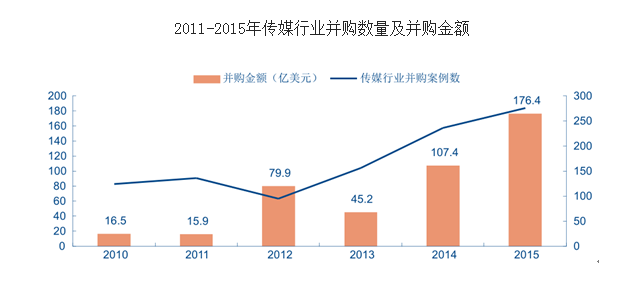 在传统产业增长速度趋缓、 互联网市场高速扩张的背景之下, 传媒并购重组成为了 2015年全年的热点所在。根据 ChinaVenture 的数据,2015 年文化传媒行业披露并购规模 176.4亿美元,披露并购案例 276 起,较 2014 年分别增长 64.15%和 16.95%。其中,包括影视、游戏、数字营销、VR 等多个子行业均呈现出较高的热度。