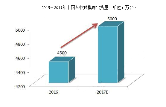 伴随着消费者已经习惯于在日常生活中使用智能手机和平板电脑,如今触摸屏也越来越多地进入汽车中。2017年车载触控面板出货量预计上看5000万,比2016年的4500万增长11%。更重要的是,在2017年的车用市场,电容触控屏的出货量预计将超过传统上占主导地位的电阻触控屏。