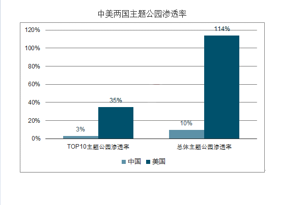 对比第一批“特色小镇”,我们可以发现绝大部份的“特色小镇”投入在 50-60 亿元。保守起见,我们平均假设每个“特色小镇”的投资额大约为 50 亿元。按照国家在 2020 年前建成 1000 个“特色小镇”的规划, 总投入资金将达到 5 万亿元。随着上海迪斯尼的火爆,主题公园受到了大家的广泛关注。 国内这几年主题公园旅游人数稳步发展, 2011 年共有 1.03 亿人次参观主题公园, 2015 年增长到 1.32 亿人次,年复合增长率约 6.4%。然而,对比两国的渗透率(主题公园接待总人数/本国居民人数),在美国,主题公园的渗透率达到惊人的 114%,而中国只有 10%。因此,我们认为主题公园在将会进入快速发展期。主题公园将会吸引越来越多的游客前来参观。