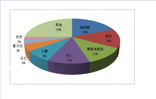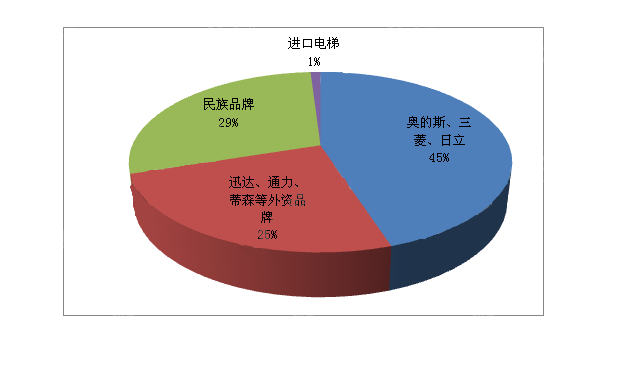 我国电梯70%左右的市场份额为外资品牌企业占据。其中,奥的斯、三菱、日立等占据了45%左右市场份额,迅达、通力、蒂森、东芝、富士达等其他外资品牌占据了25%左右的市场份额,民族品牌约占30%的市场份额。