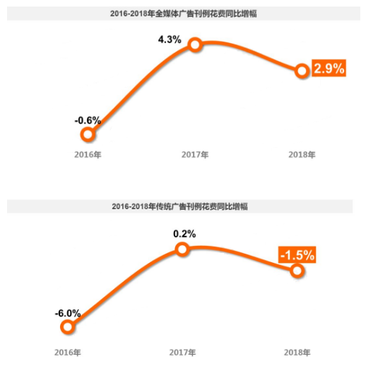 18年是中国广告市场调整与发展的一年,年初的高涨幅在年末回归稳定,最终呈现出整年微涨2.9%的趋势。