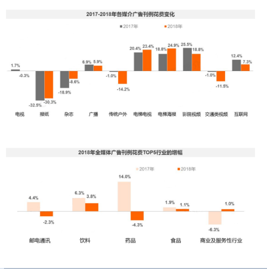 2018年全媒体广告花费的前五行业由邮电通讯、饮料、药品、食品、商业及服务性行业组成,其中饮料行业的广告花费同比上涨3.8%,食品行业的广告花费同比上涨1.1%。