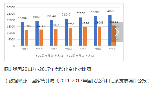 根据国家统计局《中华人民共和国2017年国民经济和社会发展统计公报》数据显示,截至2017年底,我国60周岁及以上老龄人口数达到2.41亿,占总人口比重的17.3%,其中65周岁及以上老龄人口1.58亿,占总人口比重的11.4%。我国的老龄化进程正以每年新增1000万人的速度快速发展,预计2020年65岁及以上老年人口占比将达14%,整体步入深度老龄化社会。据世界卫生组织预测,到2050年,中国将有35%的人口超过60岁,成为世界上老龄化最严重的国家。根据美国、日本等发达国家发展经验,人口的深度老龄化为健康养老产业化进程由初期步入成熟期的必要因素,因此,预计在不远的2020年,我国人口的深度老龄化,以及基数大、增长快、结构分化明显等特征,将使得我国的健康养老产业化进程加快,产业化与市场化对资源的配置作用,将倒逼我国健康养老产业的结构调整。