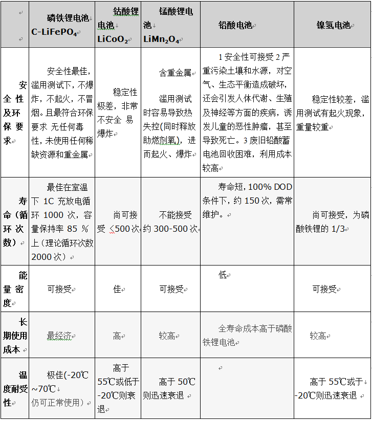 磷酸铁锂锂离子电池凭借其在循环性能、高温性能、大倍率放电、安全性能等方面的突出优势,将传统的锂离子电池的优点与磷酸盐电池的安全性结合,其主要性能指标及优点如下: