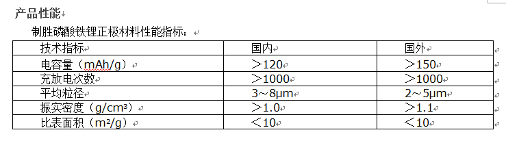 1、电池在大容量、高伏特、长寿命、安全性、环保性铁锂动力电池方面,率先在国内实现商品化、规模化生产,其水平为国际一流,国内绝对领先,主要体现在铁锂电池用正极材料合成工艺和材料组成两个方面,攻克了国内外共认的大功率充电、放电、全容量反复充放电等技术瓶颈,实现了铁锂电池正极材料的规模化生产,填补了国内外动力锂离于电池正极材料的空白并申报了十项目国家专利,开发出具有自主知识产权的大容量铁锂动力电池。综合全世界五家(美国A123、加拿大PHOSTECH、中国制胜、雷天、比亚迪)可以生产铁锂动力电池的公司,制胜铁锂电池的技术指标处于世界领先地位。有关数据对比如下: